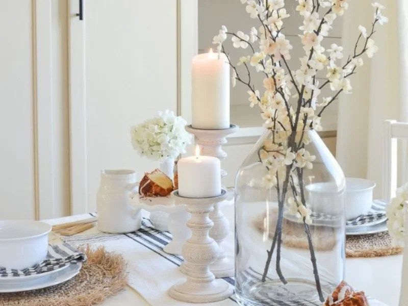 Then I add small white flowers in glass jars. This setup makes my small table feel bright, airy, and expensive without spending much.